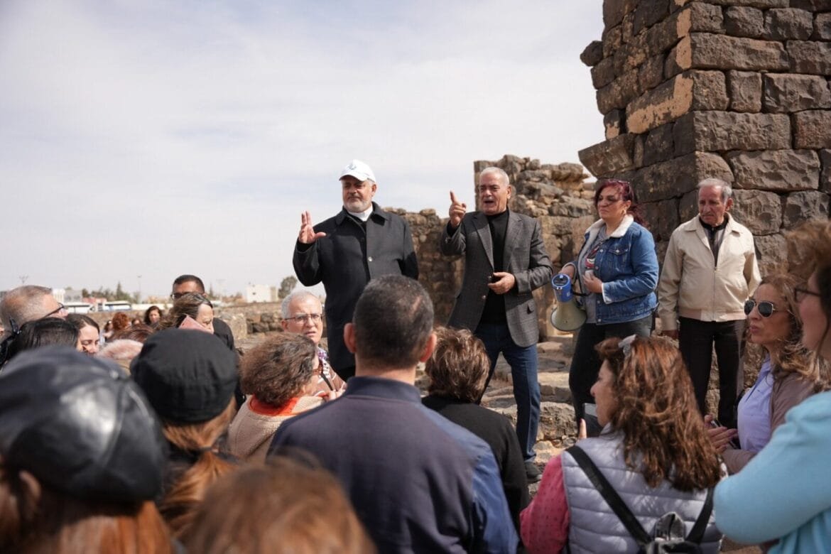 كان رئيس بلدية أم الجمال، السيد حسن الرحيبة، على رأس مستقبلي الوفد الزائر، حيث قدّم شرحًا مفصلًا عن المدينة الأثرية التي تضم 17 كنيسة، من بينها كاتدرائية المدينة التي يعود تاريخها إلى عام 557 ميلادي، والتي زارها الحضور وصلوا فيها.
