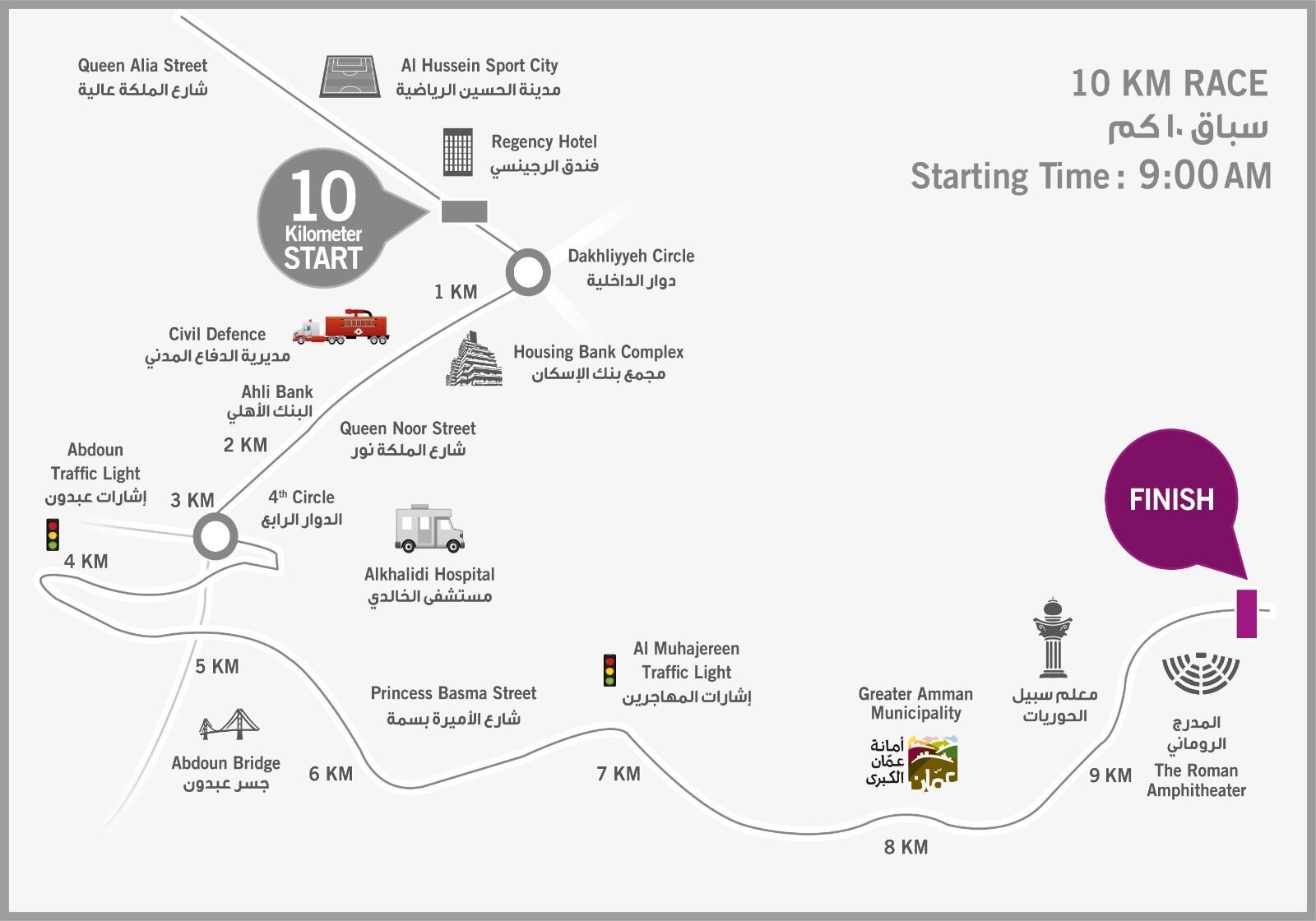 وتشمل الإغلاقات كذلك شارع عقبة بن نافع وشارع الأميرة بسمة بشكل كامل وحتى منطقة الساحة الهاشمية، وذلك من الساعة السادسة صباحاً وحتى الساعة الثانية عشرة ظهراً، ضمن مسار سباق الـ10 كم الذي ينطلق في الساعة التاسعة صباحاً.