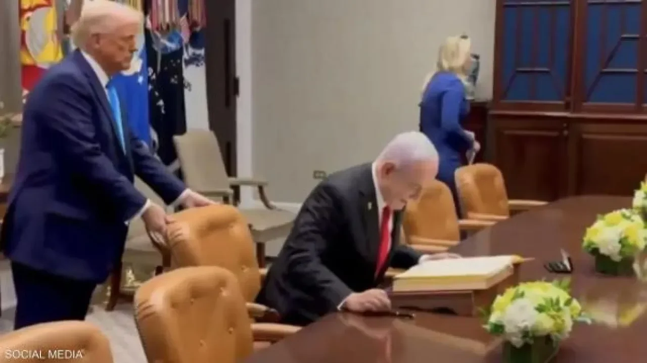 العموم نيوز: استقبل الرئيس الأميركي دونالد ترامب، يوم الاثنين، رئيس الوزراء الإسرائيلي بنيامين نتنياهو بحفاوة بالغة في البيت الأبيض. وأظهرت مقاطع فيديو نشرتها وسائل إعلام عبرية لحظة قيام ترامب بتعديل كرسي نتنياهو عند جلوسه.