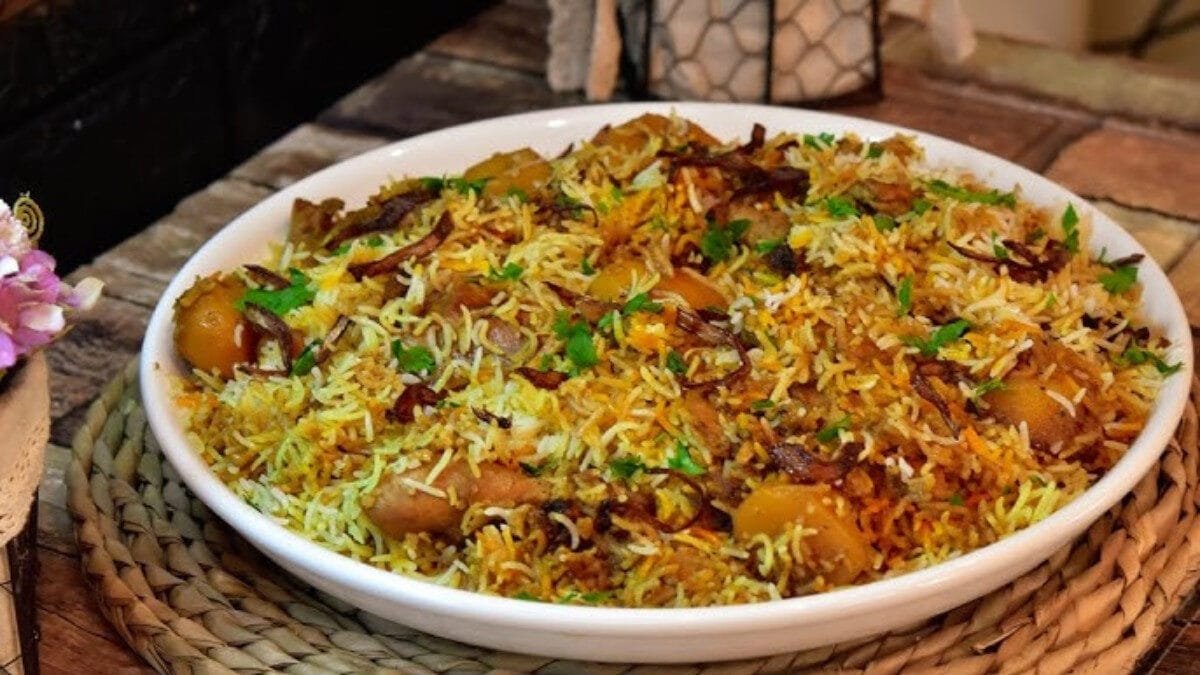 - في وعاء كبير نضع جزء من اللحم والبطاطس ثم جزء من الأزر البسمتي، وكررى هذه الطريقة حتي تنهي من كل الكمية.