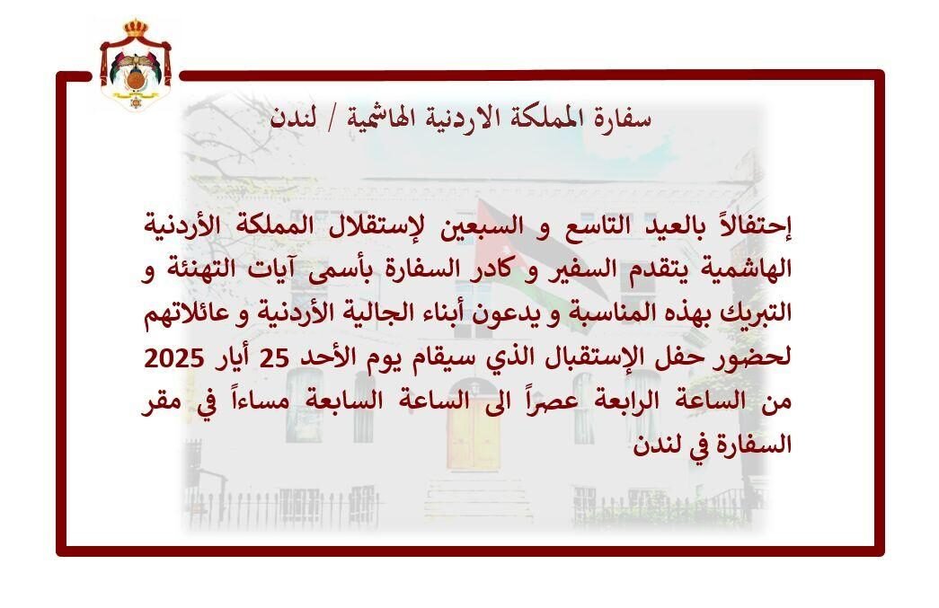 العموم نيوز: يقيم السَّفير الأردنِّيُّ في لندن السَّيِّد منار الدَّبَّاس حفل استقبال بمناسبة عيد استقلال المملكة الأردنِّيَّة الهاشميَّة في مقر السِّفارة في لندن وذلك يوم غدًا الأحد الموافق 2025/ 5/ 25 حيث دُعِيَ إليه أبناء الجالية الأردنِّيَّة في المملكة المتَّحدة.