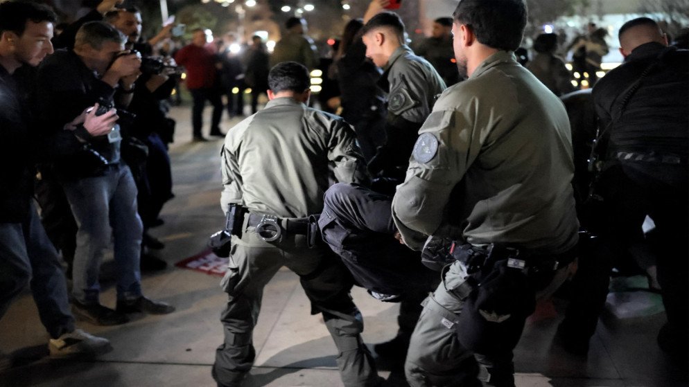 واعتُقل 4 أشخاص على الأقل كما طُرح عدد من المتظاهرين أرضا، وفق صحافيين كانوا حاضرين خلال التجمّع الذي نُظّم في ساحة هابيما في تل أبيب.
