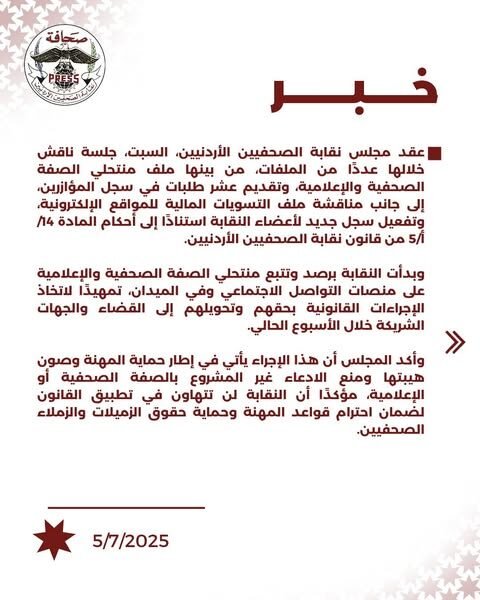 وأكد المجلس أنه سيعلن عن تعليمات وآلية التسجيل في السجل الجديد بعد الانتهاء من إعدادها بالتنسيق مع الدائرة القانونية في النقابة، داعيًا الزميلات والزملاء العاملين في الخارج إلى المبادرة بالتسجيل من خلال التواصل مع النقابة هاتفيا أو عبر منصات التواصل التابعة للنقابة.