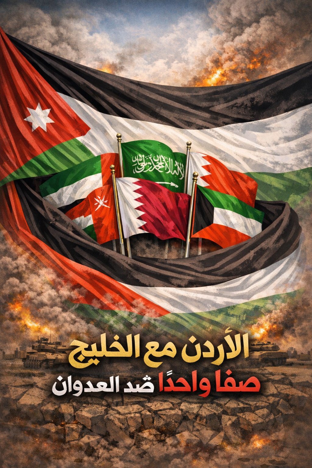 ويعكس مشهد الأعلام المرفوعة هذا المعنى بوضوح؛ حيث تلتف الأعلام الخليجية حول العلم الأردني في صورة رمزية تعبّر عن وحدة الصف والتضامن بين الأشقاء. في هذا المشهد، تبدو الأعلام وكأنها تقف معاً في خندق واحد، رسالة واضحة بأن الأخوة العربية تبقى أقوى من التحديات.