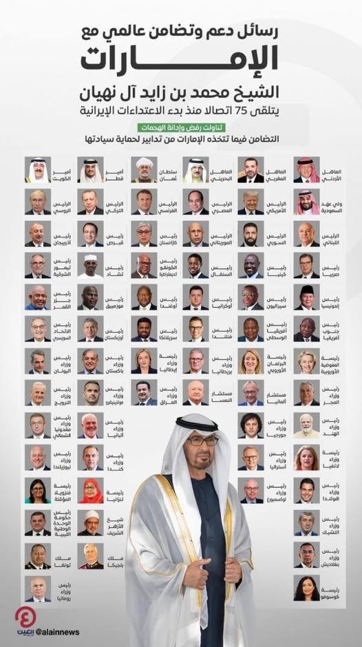 العموم نيوز:8 آذار 2026 – نشرت وسائل الاعلام الاماراتية سجلا باسماء الدول المتضامنة مع الامارات بشأن الاعتداءات الايرانية على الدولة.