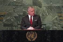 عندما ألقى جلالة الملك عبدالله الثاني، خطابا في اجتماعات الجمعية العامة للأمم المتحدة في دورتها الثامنة والسبعين التي أنعقدت في نيويورك، والتي حضرها سمو الأمير الحسين بن عبدالله الثاني ولي العهد الأردني، وسمو الأمير هاشم بن عبدالله الثاني، ليحمل مضامين هامة جدا، بحقائق ورؤى حقيقية فيما يتعلق بالقضية الفلسطينية بصورة يحتاجها الفلسطينيون، ويجدون بها طوق نجاة لكل ما يعانون ويمرون به.