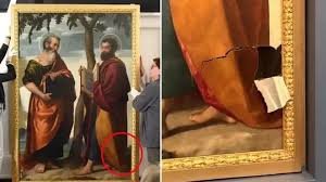 وتداولت وسائل إعلام محلية صورة للوحة المتضررة، تظهر فيها قطعة ممزقة بحجم راحة اليد في الزاوية اليمنى السفلية من الصورة.