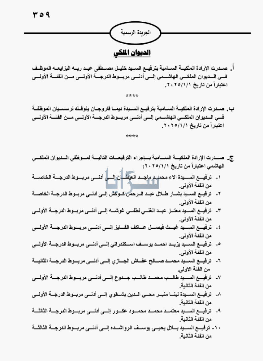 العموم نيوز: صدرت في عدد الجريدة الرسمية، الخميس، الإرادات الملكية السامية بترفع عدد من موظفي الديوان الملكي الهاشمي.