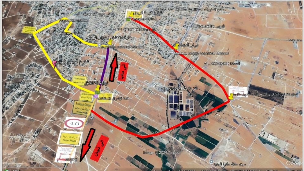 أما بالنسبة للسير القادم من منطقة ذيبان باتجاه إشارة الرسل، فقد وفرت الخطة المرورية مسارين بديلين، بحيث يتم توجيه السير في المسار الأول من إشارة الجامعة الأميركية باتجاه الطريق الدائري وصولاً إلى دوار القاضي العشائري الشيخ برنس الزبن ثم الانعطاف يساراً نحو إشارة الرسل، في حين يسلك المسار الثاني تقاطع مدارس الأخلاء باتجاه شارع الوطن العربي مروراً بشارع ابن كثير وصولاً إلى منطقة الوسط التجاري.
