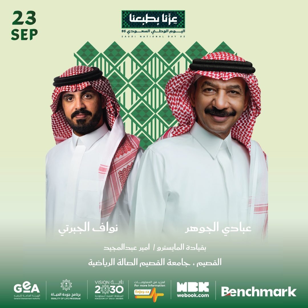 حفل عبادي الجوهر أعلنت عنه الجهة المنظمة عبر حسابها الرسمي على “إنستغرام”، وجاء في المنشور: ليلة وطنية مالها شبيه، مع أخطبوط العود عبادي الجوهر والنجم نواف الجبرتي في ليلة مميزة ضمن حفلات اليوم الوطني 95… القصيم، جامعة القصيم، الصالة الرياضية.