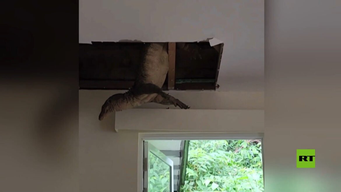 فوجئ سياح جزيرة مانوكان الماليزية بالعثور على تنين كومودو بعد أن اخترق سقف غرقتهم في الفندق.