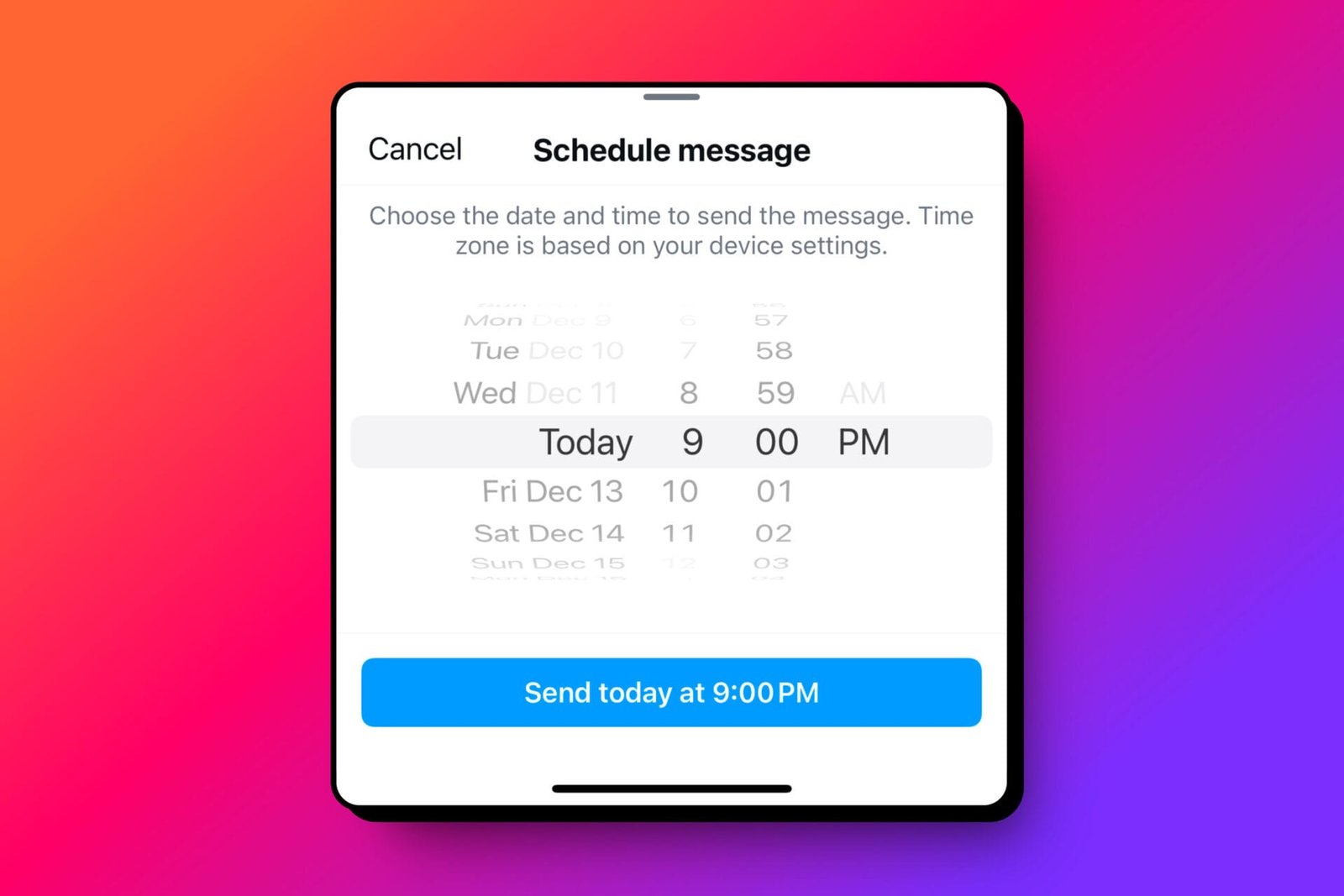 – تحديد التوقيت: اختر التاريخ والوقت المناسبين لإرسال الرسالة، ثم اضغط على الزر الأزرق لتأكيد الجدولة.