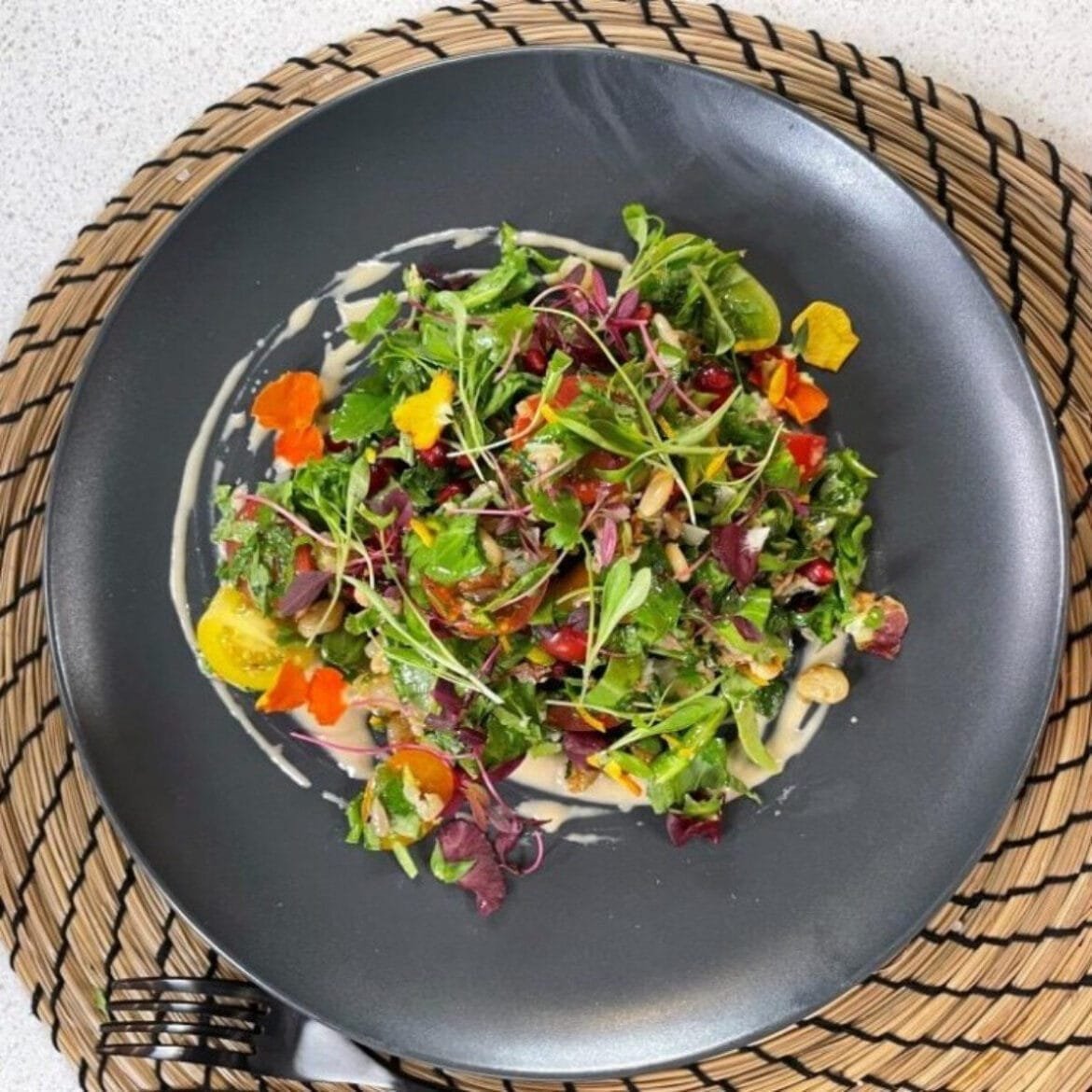 - اخلطي بعضاً من الصلصة مع الطحينة، ثم أضيفي خلطة الطحينة إلى السلطة واخلطيها، ثم ضعي الطحينة حول الطبق. وزينيه بحبات الرمّان.