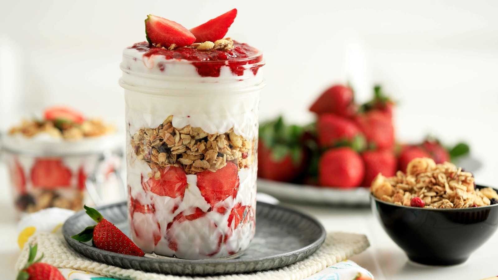 العموم نيوز: وصفة سريعة ولذيذة لبارفيه الزبادي اليوناني تُحضّر في برطمان وتحتوي على طبقات من الزبادي الكريمي، والجرانولا المقرمشة، ومربى الفراولة، وتُزيّن بشرائح الفراولة الطازجة. مثالية لفطور خفيف، أو وجبة سناك، أو حتى كتحلية صحية. إليك خطوات تحضيره.