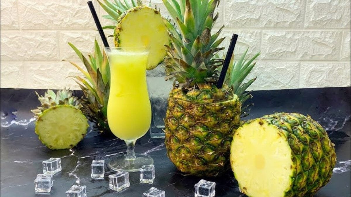 1- استخرجي عصير الأناناس بواسطة العصارة الكهربائية. ضعيه في الخلاط الكهربائي.