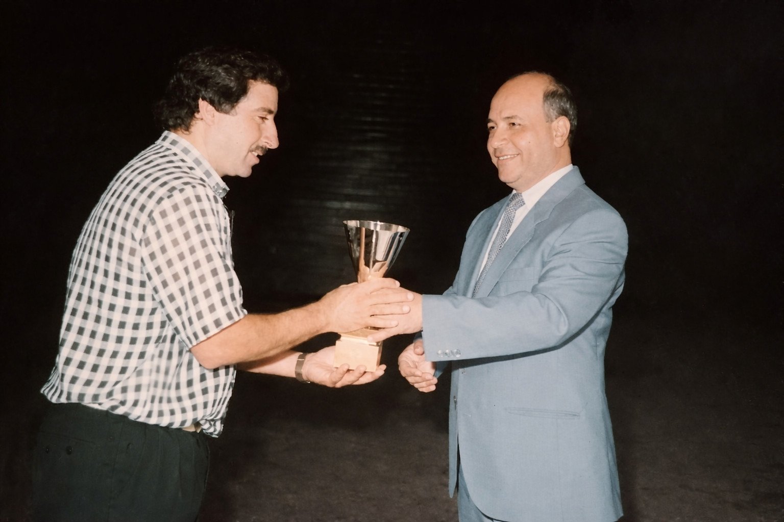 الصورة خلال قيام معالي الدكتور عوض خليفات نائب رئيس الوزراء السابق تسليم كأس للأستاذ صالح الطورة في أحد الإحتفالات