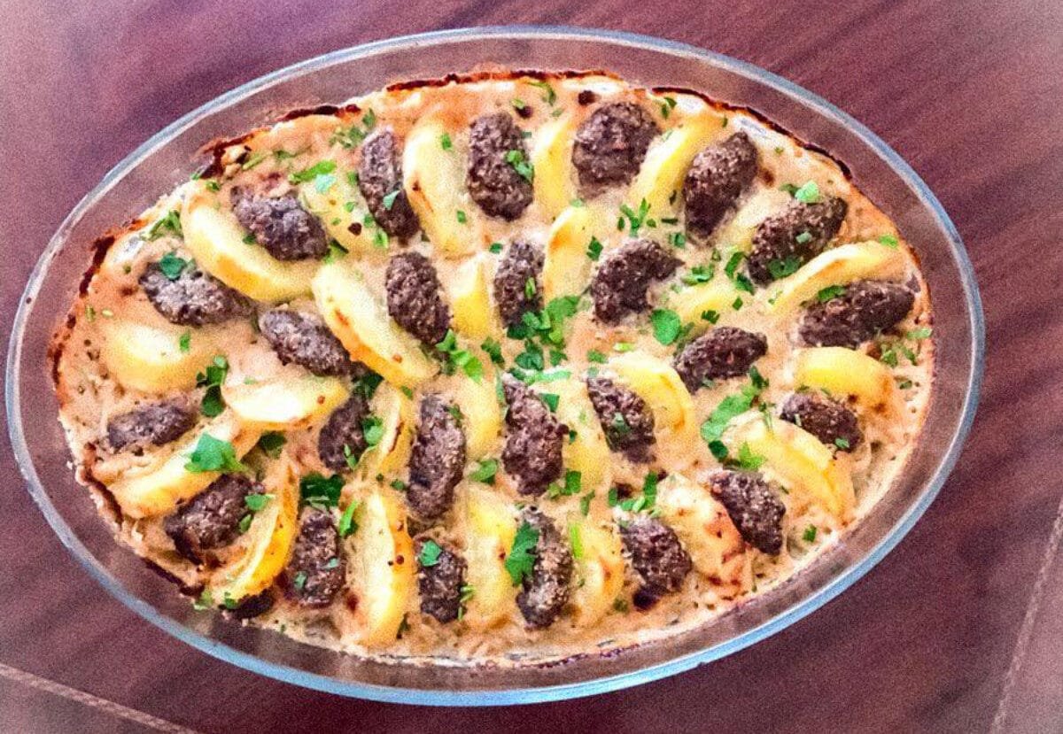 - بعد استواء الكفتة تنقل إلى صينية أخرى وتضاف شرائح البطاطا المقلية فوق الكفتة .