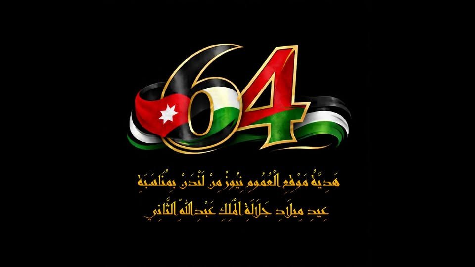 العموم نيوز من لندن بكافة منتسبيها تبعث إلى مقام حضرة صاحب الجلالة الهاشمية الملك عبدالله الثاني ابن الحسين المعظم بأجمل أيات التهاني والتبريك بمناسبة عيد ميلاد جلالته ال ( 64 ) ضارعين لله العلي القدير أن يحفظ جلالته وولي عهده الأمين وأسرته الكريمة وألاردن الحبيب وشعبه الغالي من كل مكروه.