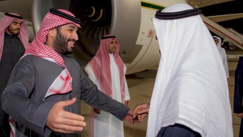 ولي العهد السعودي الأمير محمد بن سلمان لحظة وصوله إلى الإمارات وعلى رأس المستقبلين له الشيخ محمد بن زايد رئيس دولة الإمارات