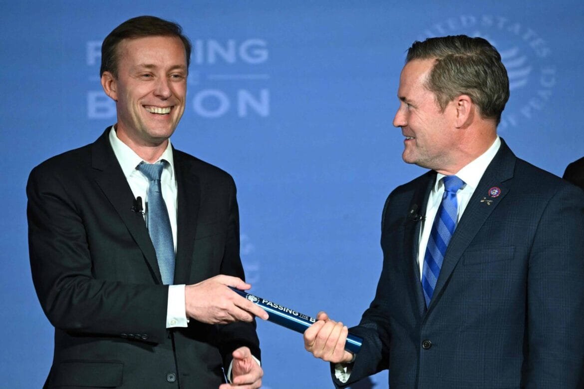 وسلم مستشار بايدن للأمن القومي جيك سوليفان عصا رمزية إلى عضو مجلس النواب مايك والتز، الذي اختاره ترامب للمنصب نفسه، في إحياء لطقوس في واشنطن ينظمها معهد الولايات المتحدة للسلام منذ عام 2001.