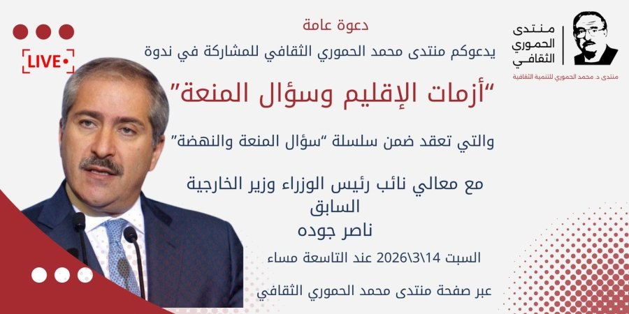 العموم نيوز: يعقد منتدى الدكتور محمد الحموري للتنمية الثقافية، اليوم السبت، الجلسة الثانية من سلسلة ندواته الفكرية لهذا العام بعنوان “سؤال المنعة والنهضة”، في جلسة تحمل عنوان “أزمات الإقليم وسؤال المنعة”، يشارك فيها نائب رئيس الوزراء ووزير الخارجية الأسبق ناصر جودة.