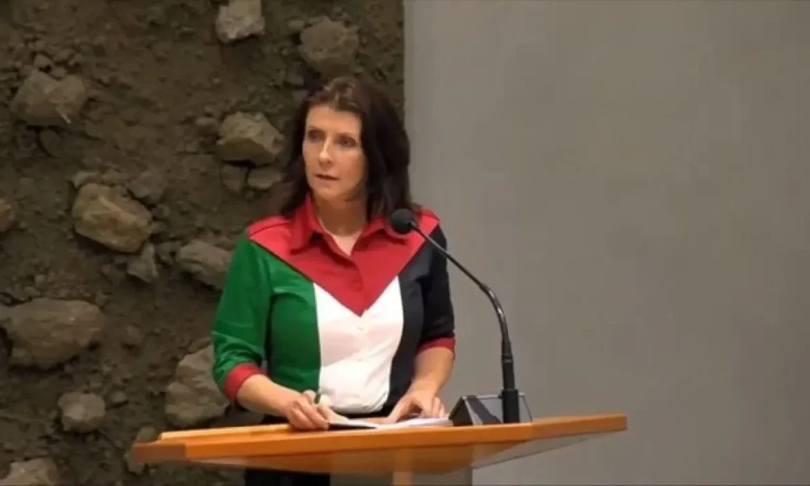 العموم نيوز: شهد البرلمان الهولندي حالة من الجدل خلال جلسة المناقشات السياسية العامة، بعدما ظهرت النائبة إستير أووهاند مرتدية قميصاً يحمل ألوان علم فلسطين.