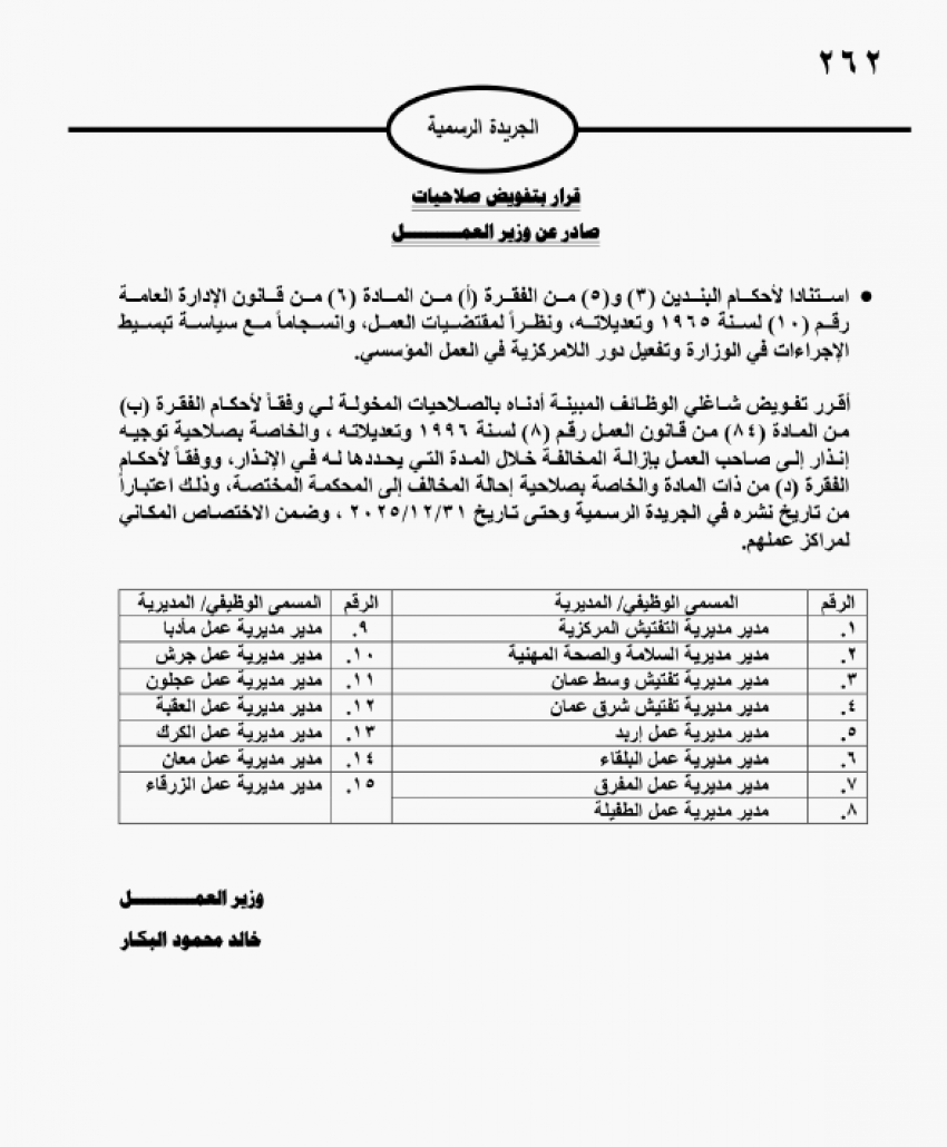 العموم نيوز: صدر في عدد الجريدة الرسمية، الخميس، قرار وزير العمل، الدكتور خالد البكار بتفويض 15 مديراً عاماً من مديريات الوزارة، بصلاحياته.