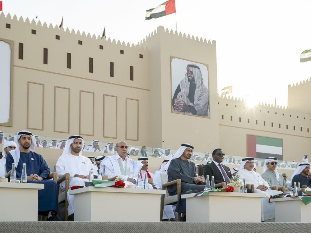وشملت الفعاليات..عزف السلام الوطني لدولة الأمارات وأغنية ترحيبية وعروض الفرق التراثية ولوحات من فنون “العازي والعيالة والندبة” بجانب استعراضات الخيل والهجن إضافة إلى “العرض السينوغرافي الموريتاني” بعنوان “روح الأخوة” وغيرها من الفعاليات التي نالت استحسان الجمهور.. كما حلقت طائرات للقوات الجوية والدفاع الجوي تحية لصاحب السمو رئيس الدولة وضيوف الإمارات.
